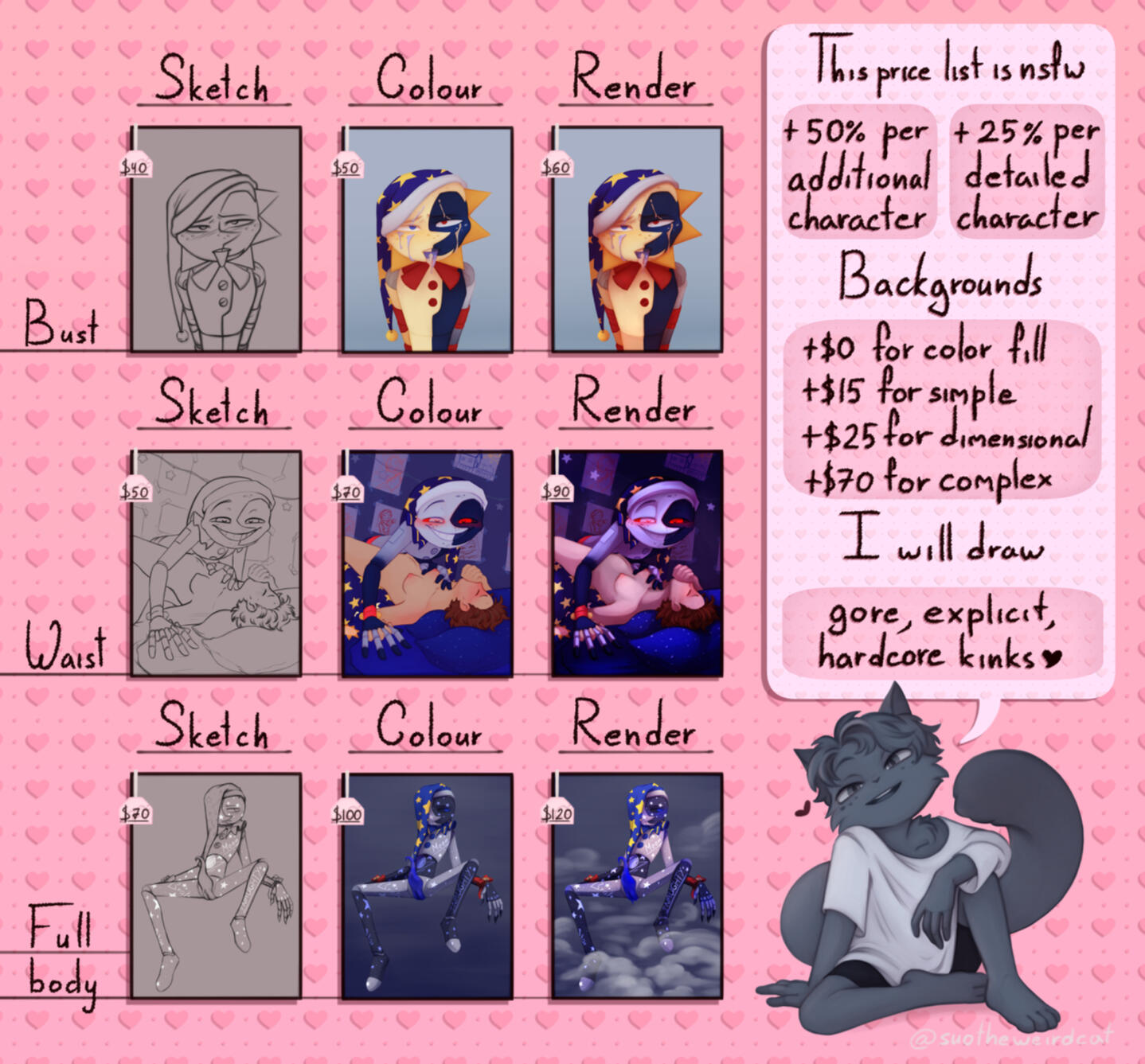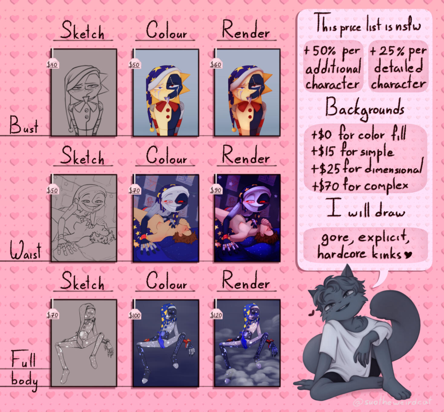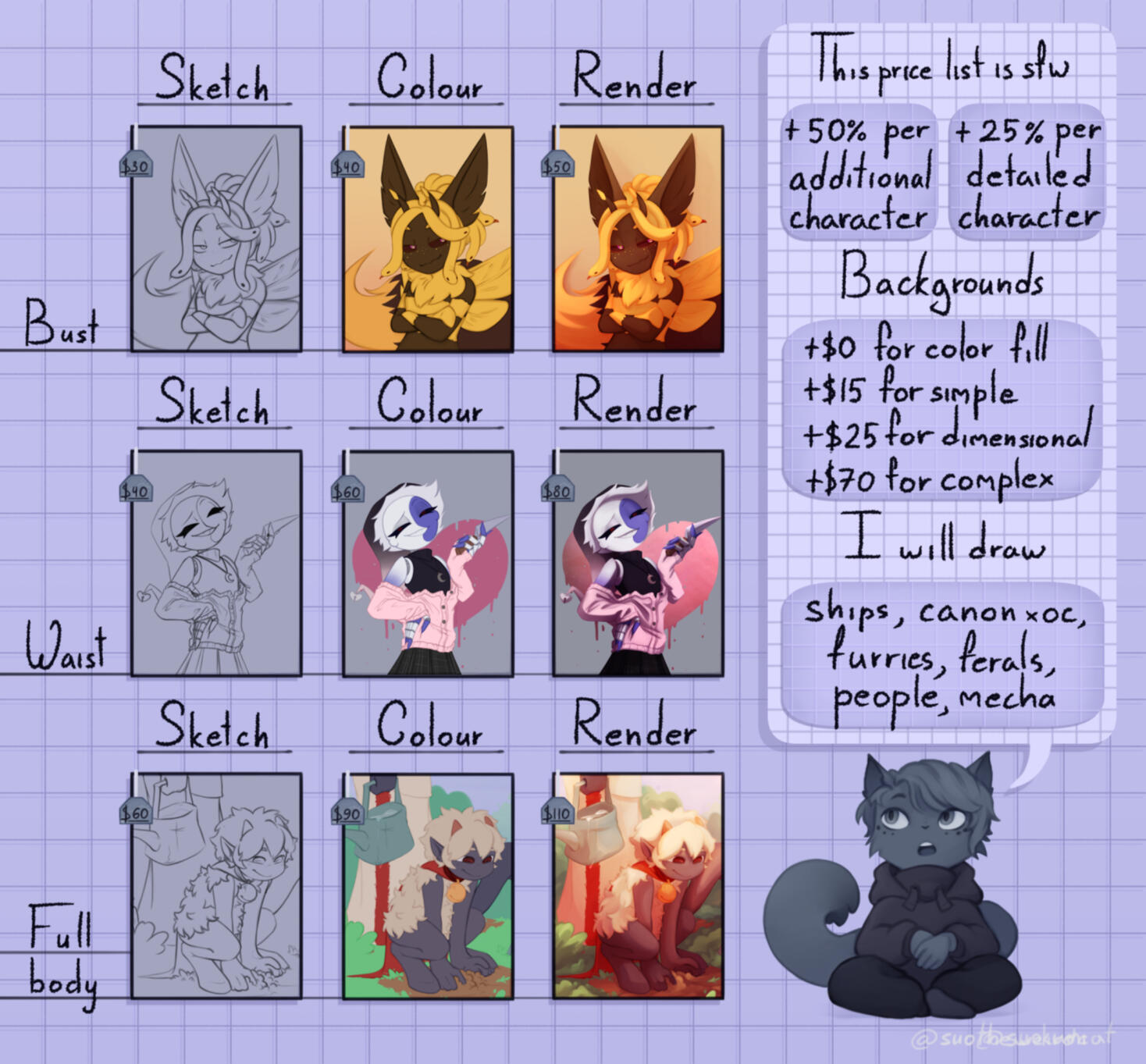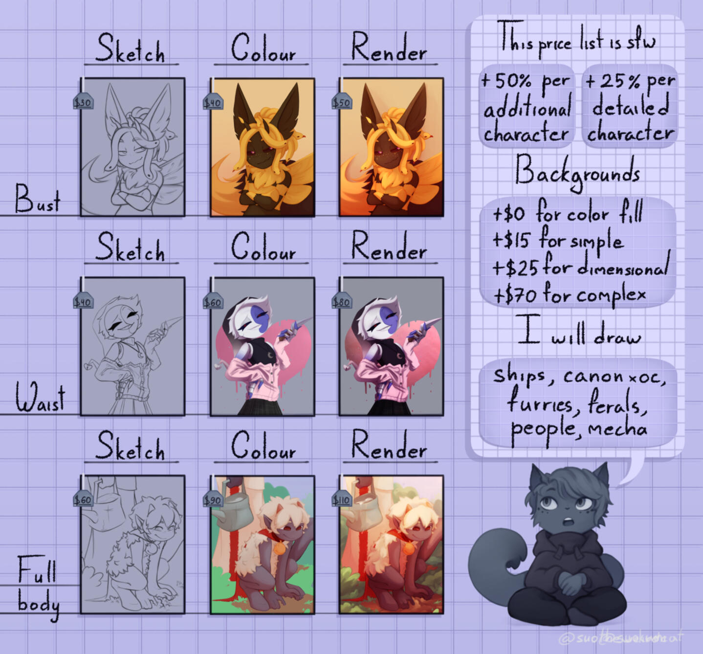 Terms of service• Commissions are for personal use only. Client has a right to use and reproduce the order for personal consumption. Client does not get the commercial rights of the product.• I do not set any deadlines, unless it was discussed beforehand. It takes me from a week to a month to finish the artwork.• Each update requires confirmation for me to proceed.• Even though I’m fine with almost anything, I still have the right to decline a commission for any reason.• When ordering, provide as many references and information as possible. Please, be straight forward with what you want, the result is based on all the provided material, and my interpretation of it.• Available payment methods: EasyStart, Paypal.• Payment must be given after confirmation of the draft.• You can contact me through discord "suokumi"